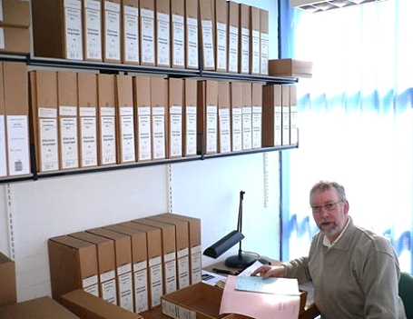 På billedet herunder ses Dines på Landsarkivet, sammen med de 42 kasser der rummer alle afhørings rapporterne om Dobbeltmordet. Billedet er taget i 2005, hvor Dines som den første fik adgang til HELE sagen.